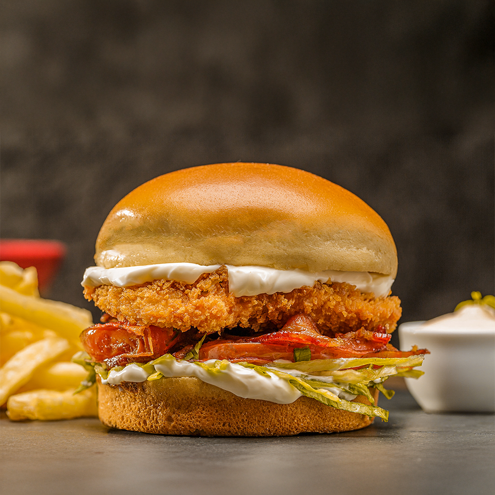 CHICKEN FINGERS BURGER ÇITIR TAVUK, MAYONEZ, KIVIRCIK MARUL, DOMATES, PATATES CİPSİ