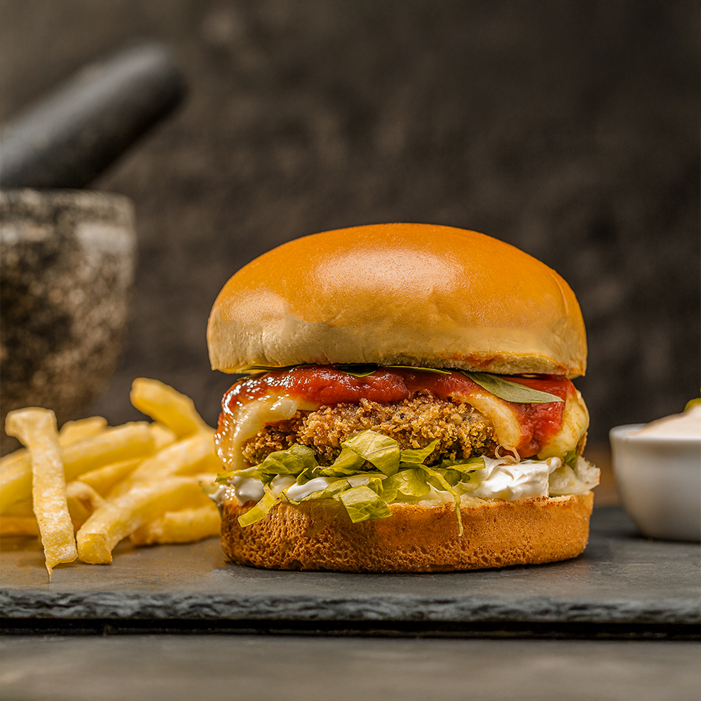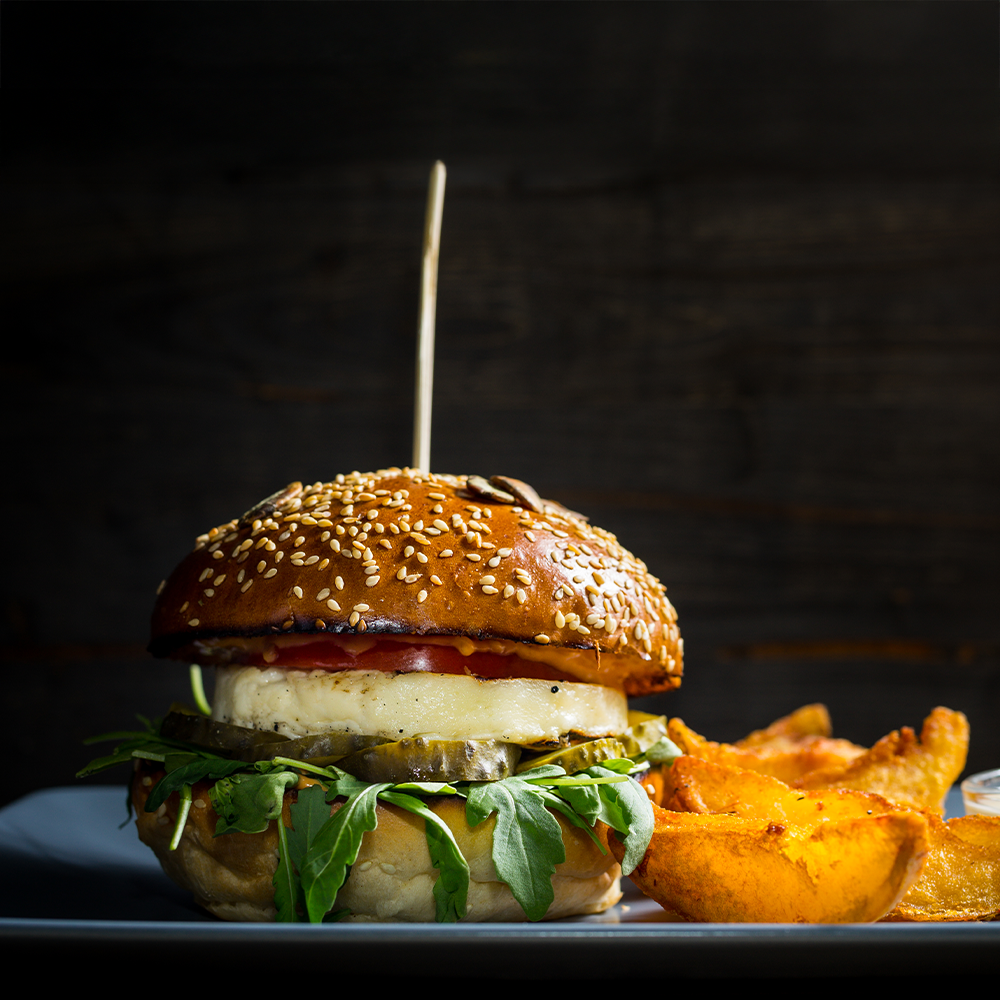 BARBEKÜ HELLİM BURGER DANA BURGER KÖFTESİ, IZGARA HELLİM PEYNİRİ, SOĞAN HALKASI, BARBEKÜ SOS, KIVIRCIK MARUL, TURŞU, DOMATES, PATATES