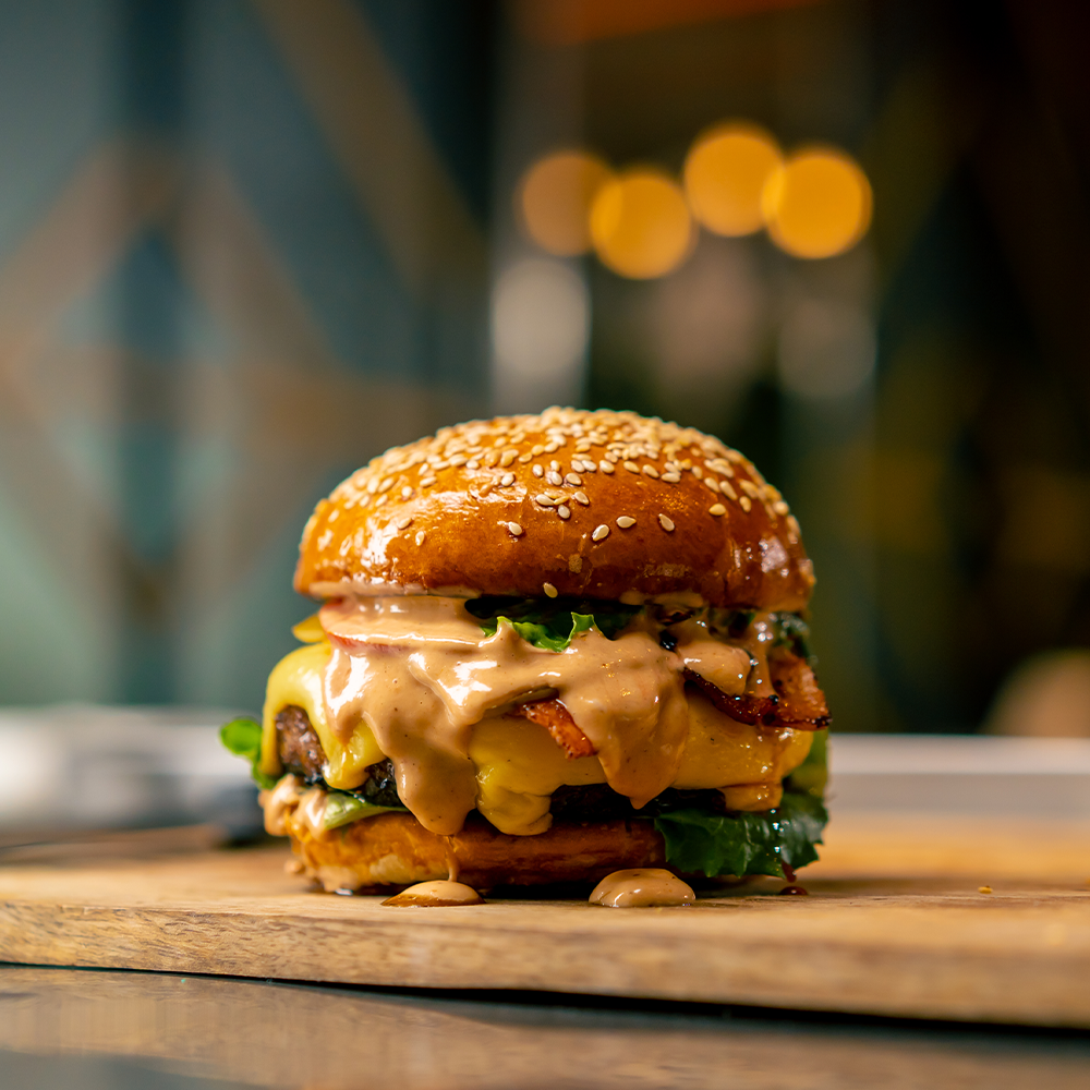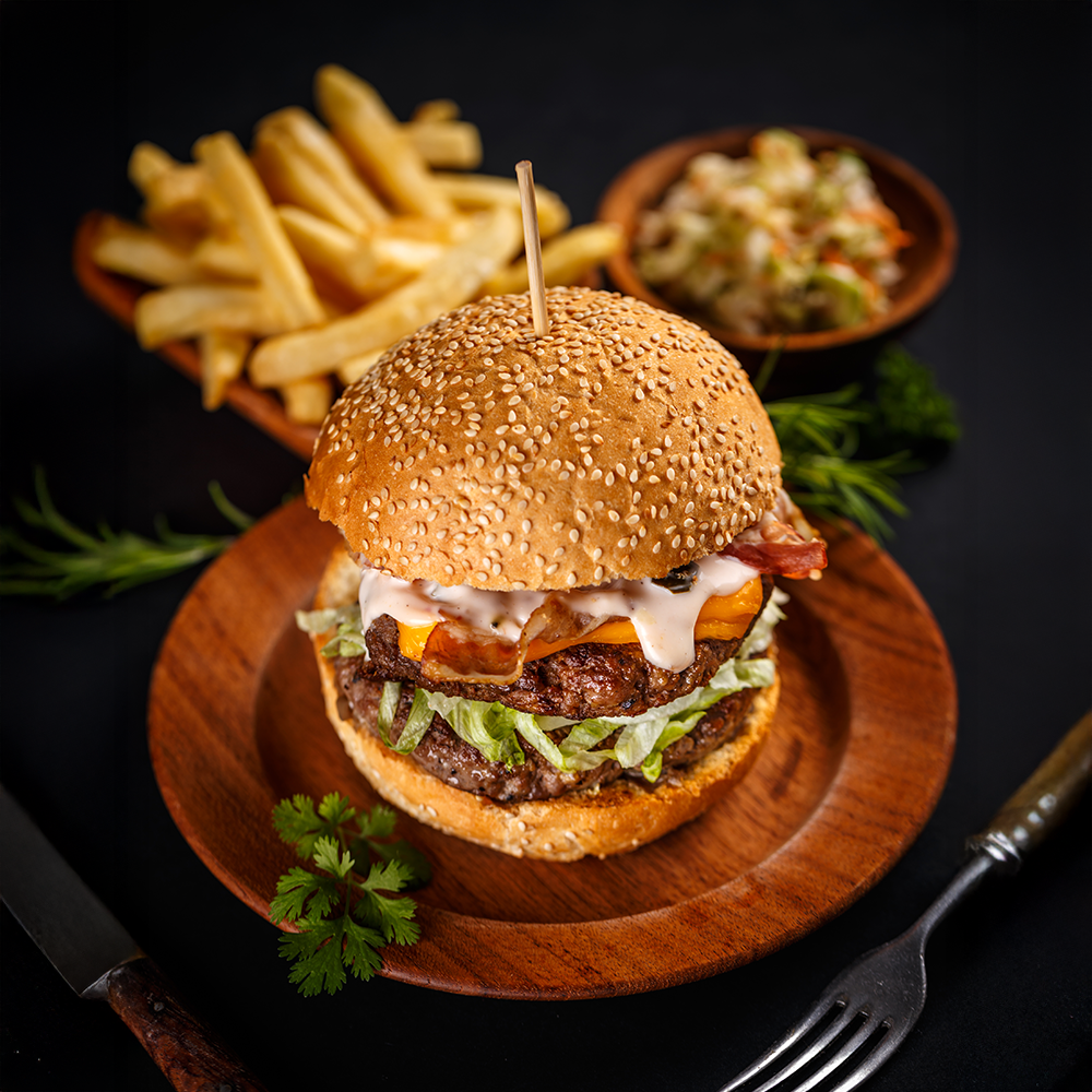BURGER DE SHİMALL FIRINDA TEREYAĞLI ÖZEL EKMEK, ALT TABAKADA TRÜF MANTARLI MAYONEZ, ÜST TABAKADA ÖZEL BURGER RELISH SOS, DANA BURGER KÖFTESİ, DANA JAMBON, KİBRİT PATATES, CHEDDAR PEYNİRİ, ICEBERG MARUL, TURŞU